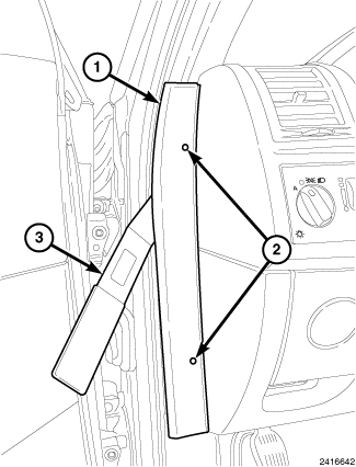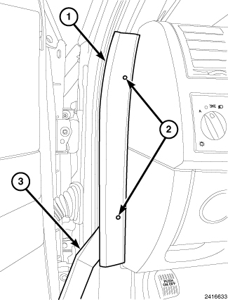 2. Using trim tool or equivalent (3), directly below the upper retaining clip (2), release the clip and remove the upper cowl trim panel (1).