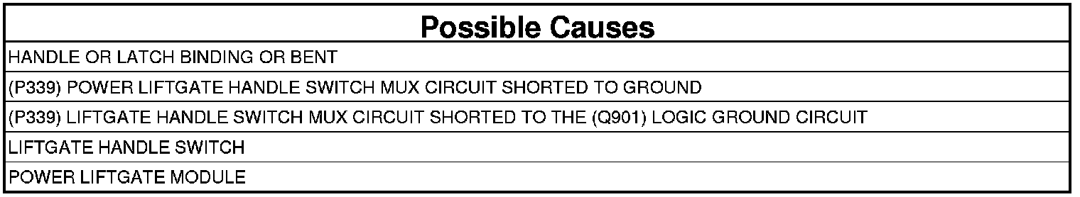 - Repair the (P339) Liftgate Handle Switch Mux circuit for a short to the (Q901) Logic Ground circuit.
