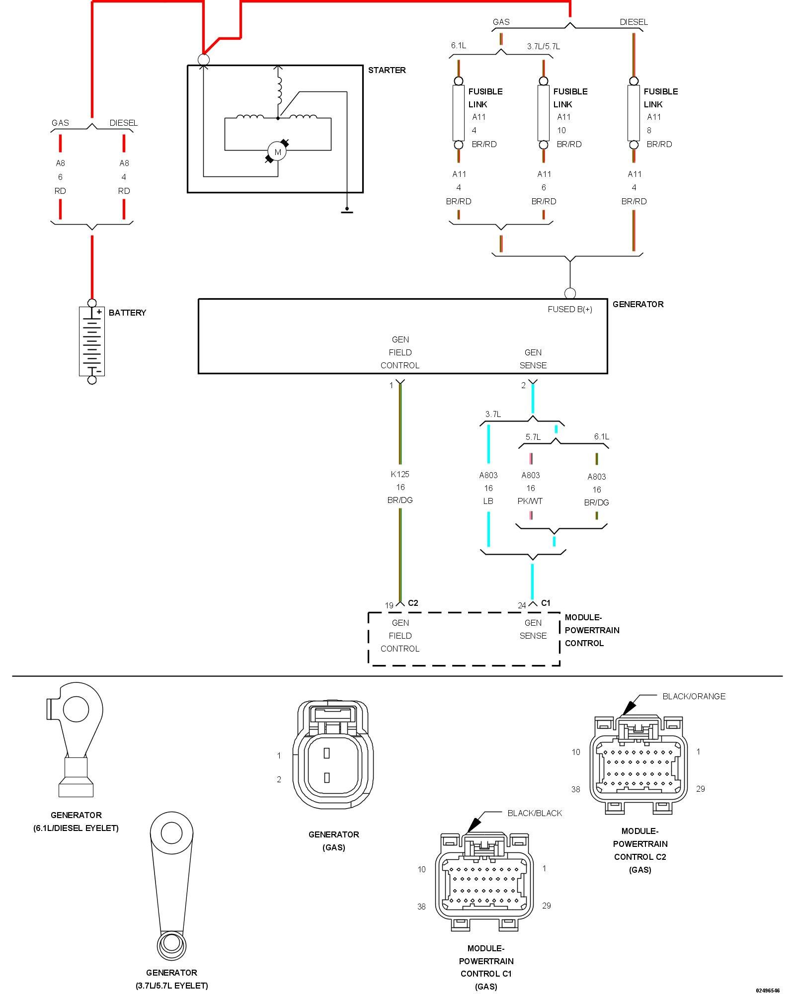 1. Using the wiring diagram/schematic as a guide, inspect the wiring and connectors between the Generator and the Powertrain Control Module (PCM).