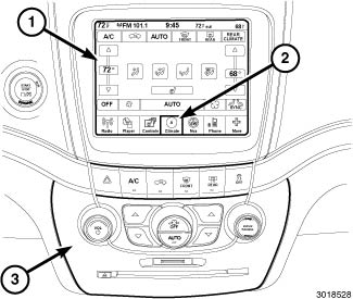 The controls for the front heating and A/C system are located in the U-Connect Touch (TM) screen module (1) under the Climate tab (2), and on the switchbank (3) at the center of the instrument panel.