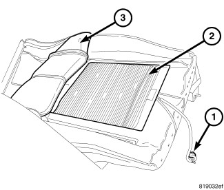 1. Position the seat cover (3) on the cushion foam while being careful not to damage the heating element (2) and connector (1), if equipped.