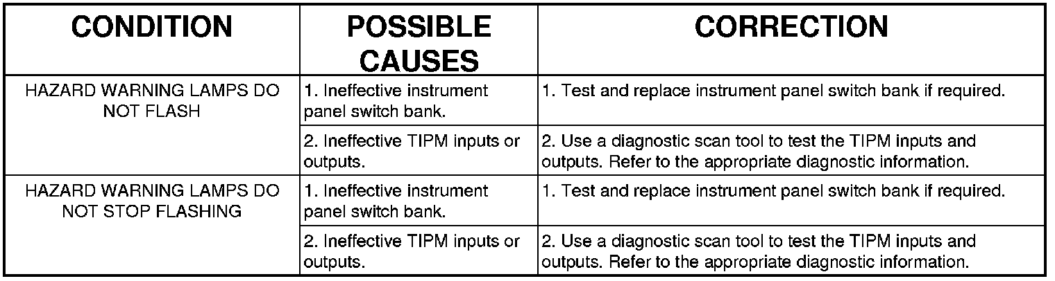 NOTE: The hazard switch is integral to the instrument panel switch bank, which provides a hard wired output to the TIPM. Before performing any of the following tests, confirm whether the left and right turn signals operate satisfactorily. Then determine whether the other functions of the instrument panel switch bank are operational. If the turn signals are ineffective or operate improperly, or if the other instrument panel switch bank functions are ineffective, diagnose and repair those problems before attempting to repair the hazard warning lamps system.