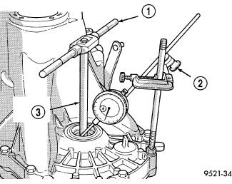 6. Apply a medium load to differential with Torque Tool (3) and a T-handle (1)(Figure 16), in the downward direction. Roll differential assembly back and forth a number of times. This will settle the bearings. Zero the dial indicator (2). To obtain end play readings, apply a medium load in an upward direction while rolling differential assembly back and forth. Record end play.