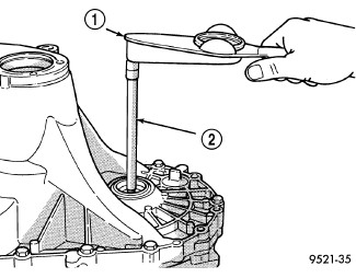 9. Install clutch bellhousing. Install and tighten case bolts to 25 Nm (225 in. lbs.). Using Torque Tool (2) and an inch-pound torque wrench (1), check turning torque of the differential assembly. The turning torque should be 6 to 12 in. lbs. If the turning torque is too high, install a 0.05 mm (0.002 inch) thinner shim. If the turning torque is too low, install a 0.05 mm (0.002 inch) thicker shim.