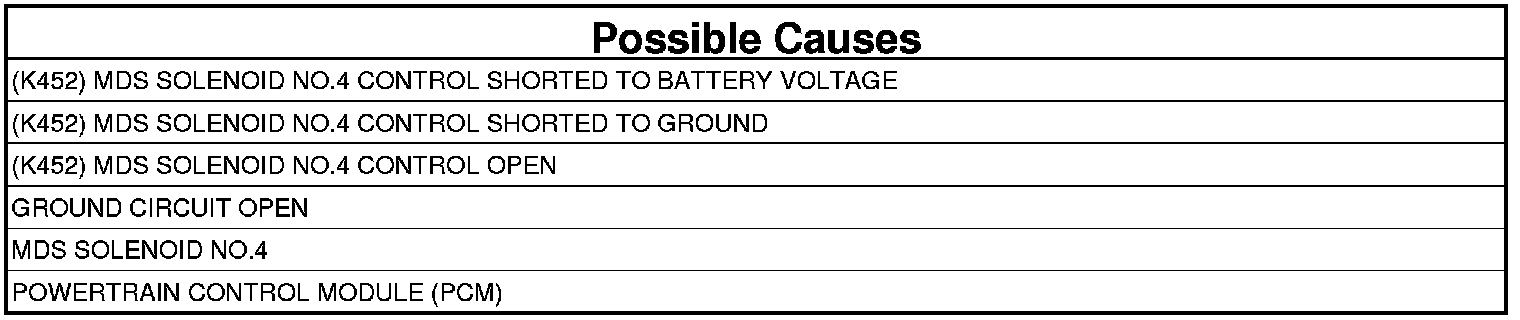 - Repair the short to ground in the (K452) MDS Solenoid No.4 Control circuit between the PCM harness connector and the C101 harness connector.