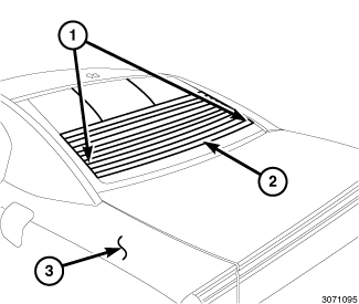 The rear window defogger system, also known as the Electric Back Light (EBL), consists of two vertical bus bars (1) linked by a series of grid lines (2) fired onto the inside surface of the rear window (3).