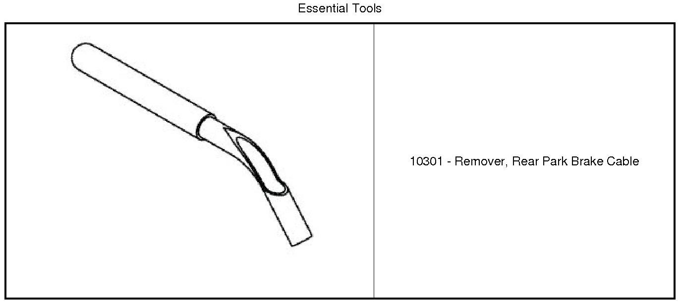 Using Rear Park Brake Cable Remover - (2), insert the tool over the park brake cable end and press in to release the retaining clips, then pull the cable (1) out of the knuckle from the back.
