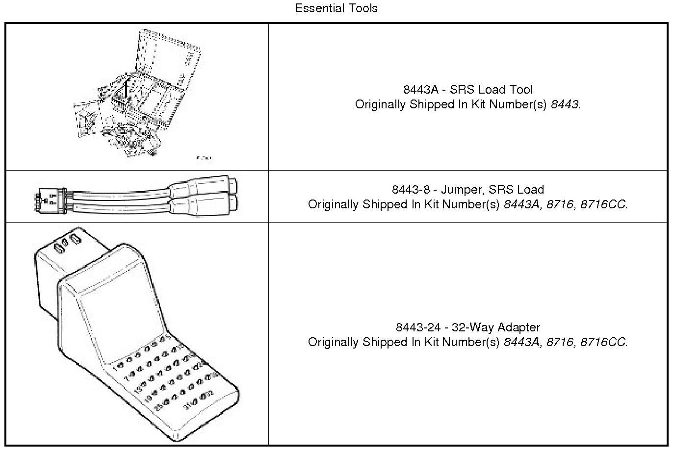 When powered, the Occupant Restraint Controller (ORC) sends a test current to the squibs to verify the integrity of the squib and wiring. These circuits are maintained in a "floating" configuration at the module (connected to neither power nor ground), as protection against inadvertent deployment. Use of the (8443A) in the tests below substitutes a suspect squib with a known good component. The use of the SRS Load Tool Adapter provides a test point as well as a method for opening the shorting bar connections within the harness connector.