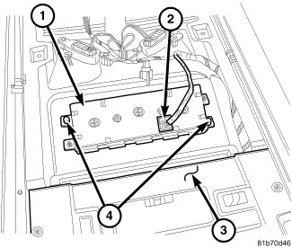 2. Install the two screws (4) that secure the rear A/C-heater control to the rear overhead console. Tighten the screws to 1.2 Nm (10 in. lbs.).