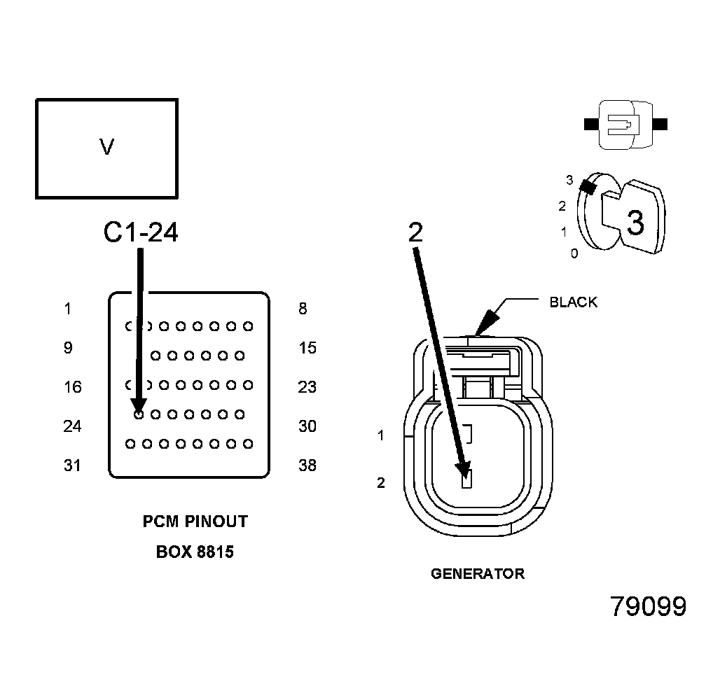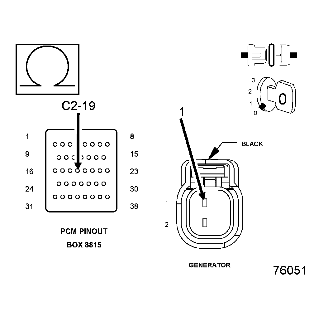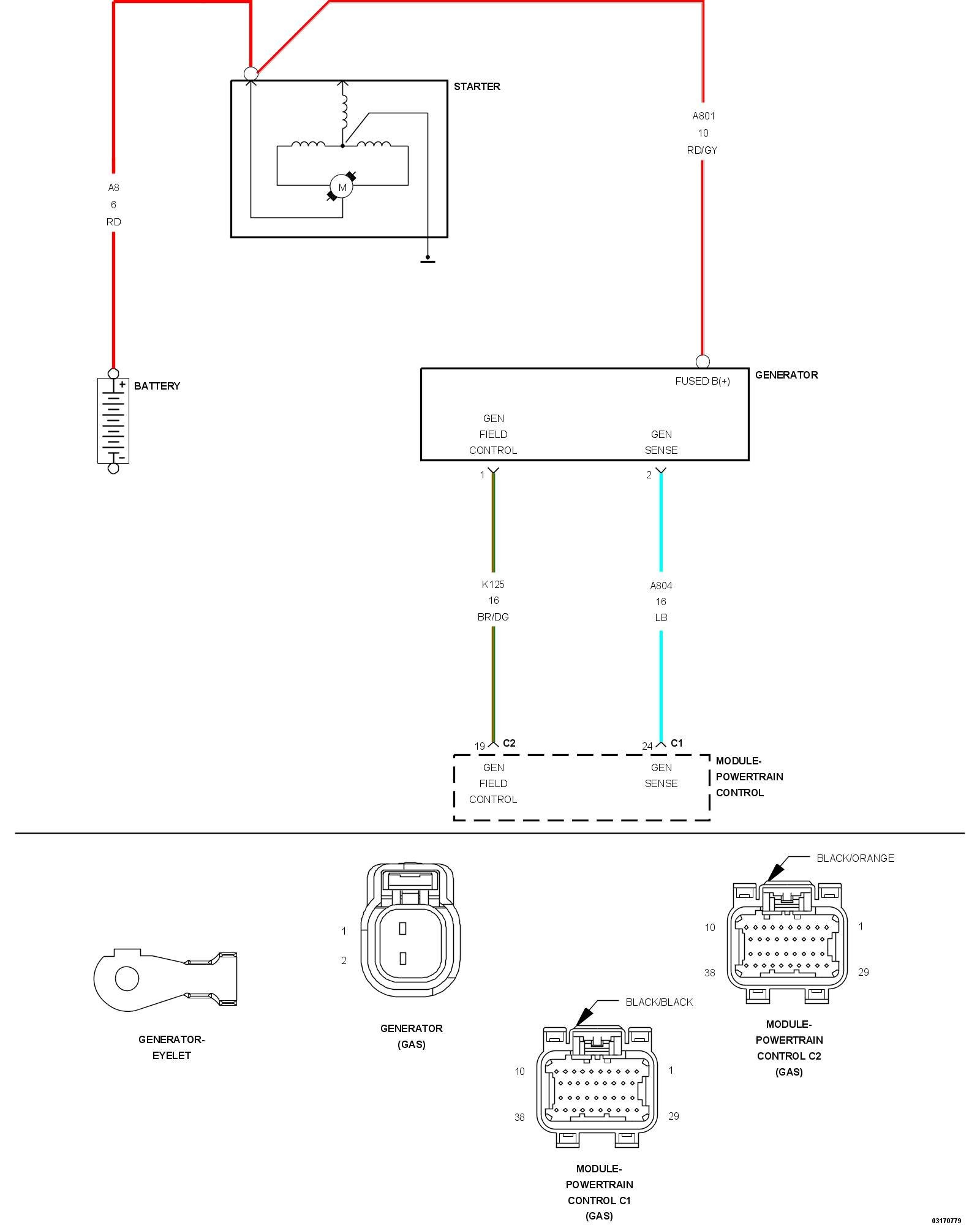 1. Using the wiring diagram/schematic as a guide, inspect the wiring and connectors between the Generator and the Powertrain Control Module (PCM).