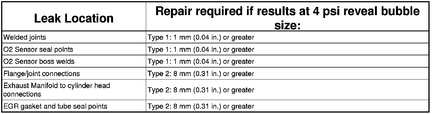 - Type 1 Leak is defined as a leak where very small foam like bubbles 1 mm (0.04 of an inch) or less appear. Any Type 1 or greater leaks found in welded joints, O2 sensor seal points or O2 sensor boss welds must be repaired or the component must be replaced.