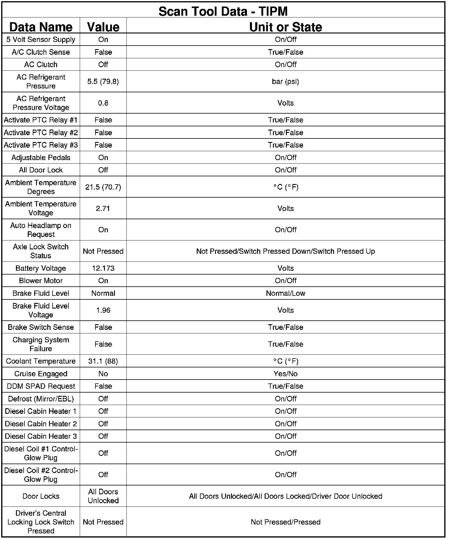 The following chart lists data values taken from the Scan Tool Totally Integrated Power Module (TIPM) data list. The data is to be used for reference only.