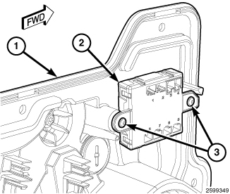 4. Remove the two screws (3) that secure the module to the front door hardware module carrier (1).