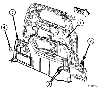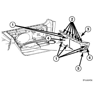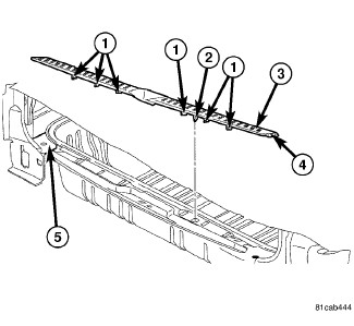 b. Carefully engage the scuff plate end tabs (4) into the left and right quarter trim panels (5).