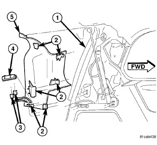 b. Align the locating tabs (4) with the holes in the left quarter trim panel.