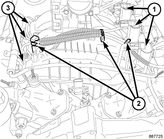 4. Before installing the ignition coil (1), check the condition of the coil O-ring and replace as necessary. Apply silicone based grease such as Mopar(R) Dielectric Grease into the spark plug end of the rubber boot, coil O-rings and to the top of spark plugs.