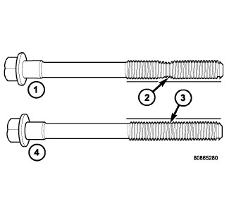 The cylinder head bolts are tightened using a torque plus angle procedure. The bolts must be examined BEFORE reuse. If the threads are necked down (2) the bolts should be replaced.