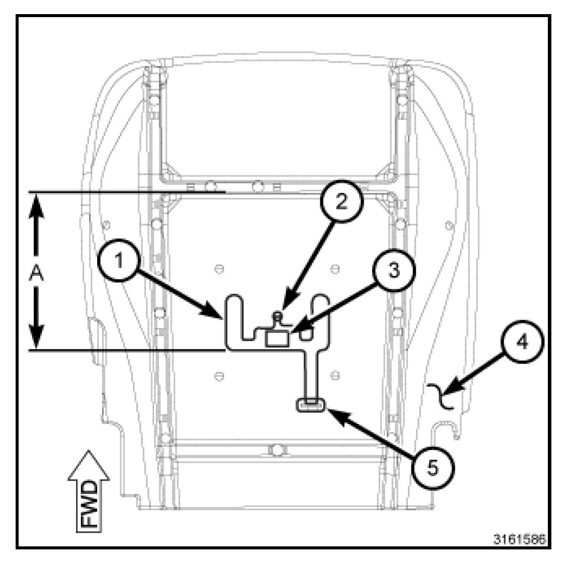 1. Position the Occupant Detection Sensor (ODS) mat (1) on the seat cushion foam with the front edge of the mat positioned 70 millimeters (2.76 inches) (Distance A) rearward from the back edge of the forward crimp channel in the seat cushion foam (3).