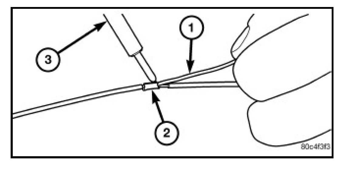 5. Using rosin core type solder (1) only and a suitable soldering iron (3), solder the wire and splice band connection (2) together.