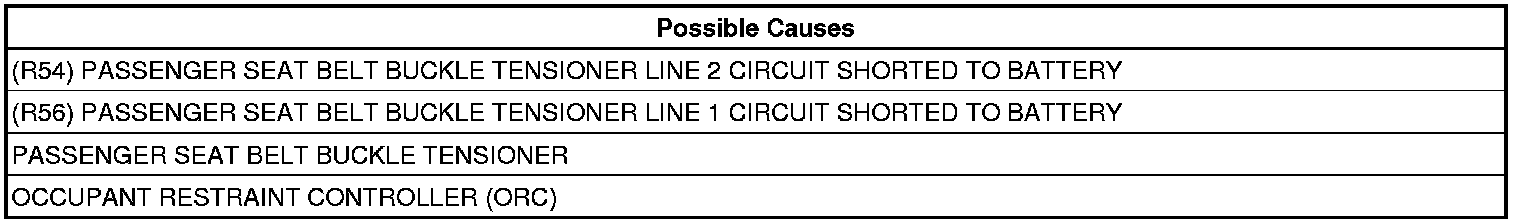 3. CHECK (R56) PASSENGER SEAT BELT BUCKLE TENSIONER LINE 1 CIRCUIT AND (R54) PASSENGER SEAT BELT BUCKLE TENSIONER LINE 2 CIRCUIT FOR A SHORT TO BATTERY