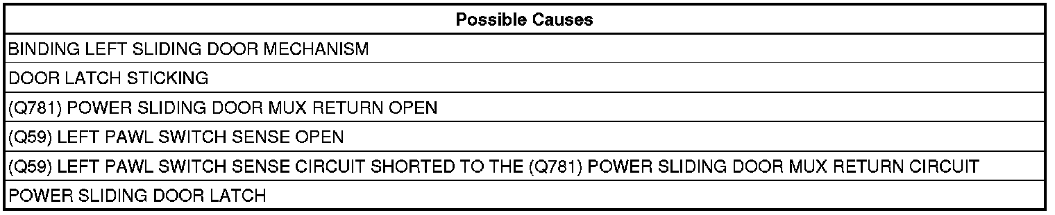 - Repair the (Q59) Left Pawl Switch Sense circuit for a short to the (Q781) Power Sliding Door Mux Return circuit.