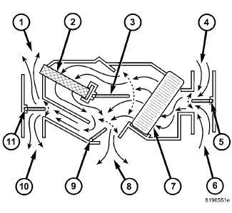 The standard front heating and A/C system pulls outside (ambient) air through the fresh air intake (4) located at the cowl panel at the base of the windshield and into the air inlet housing above the Heating, Ventilation and Air Conditioning (HVAC) housing and then passes through the A/C evaporator (7). Air flow is then directed either through or around the heater core (2). This is done by adjusting the position of the blend-air door(s) (3) with the temperature control(s) located on the A/C heater control in the instrument panel. Air flow is then directed out the floor outlet (8), instrument panel outlet (10) or the defroster outlet (1) in various combinations by adjusting the position of the mode-air doors (9 and 11) using the mode control located on the A/C heater control. The temperature and mode control uses electrical actuators to operate the air doors.