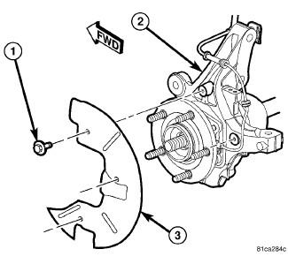 5. Remove screws (1) fastening brake shield (3) to knuckle (2), then remove brake shield.