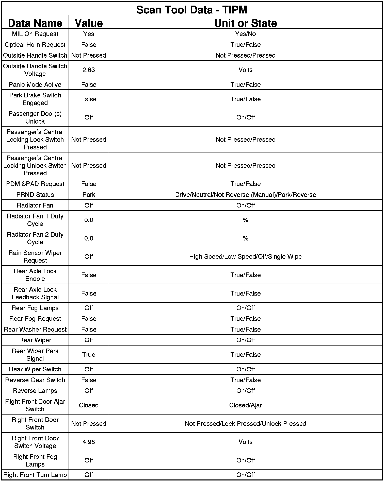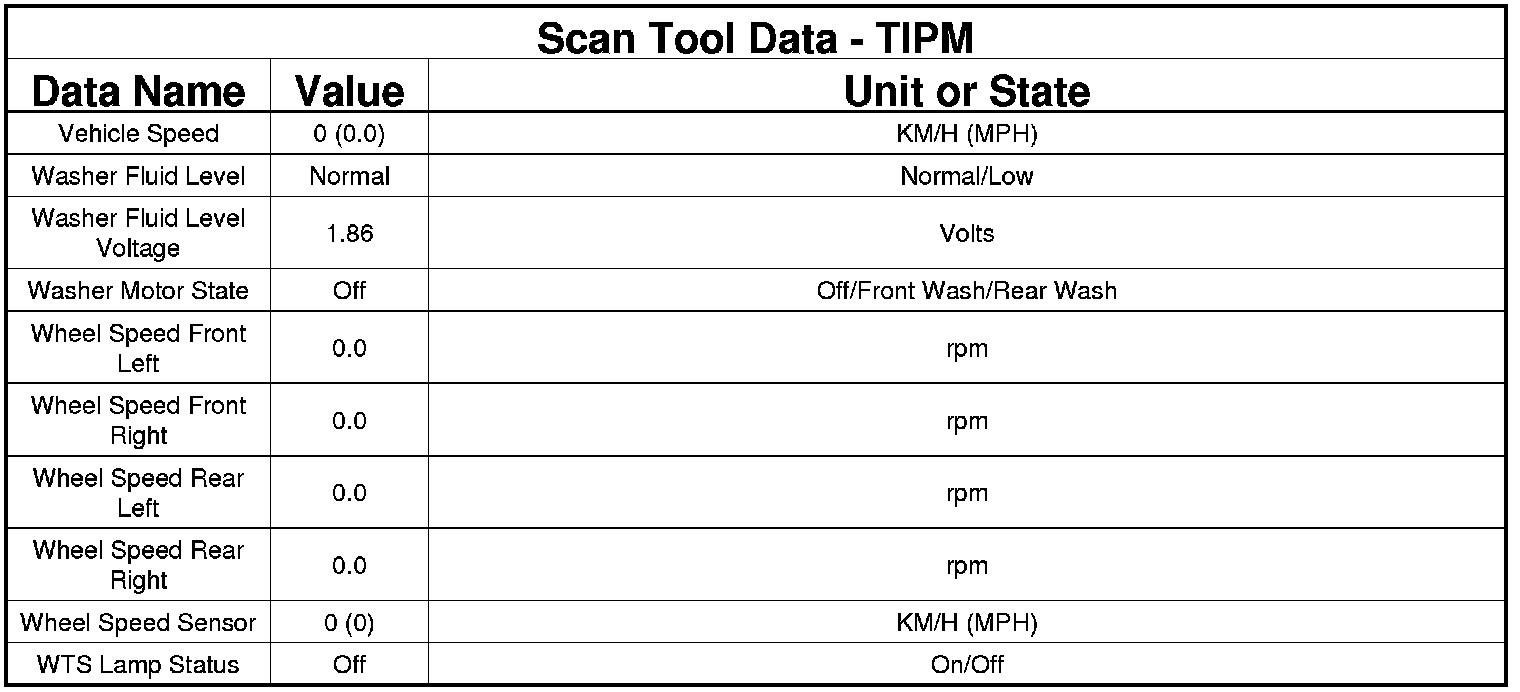 The following chart lists data values taken from the Scan Tool Totally Integrated Power Module (TIPM) data list. The data is to be used for reference only.