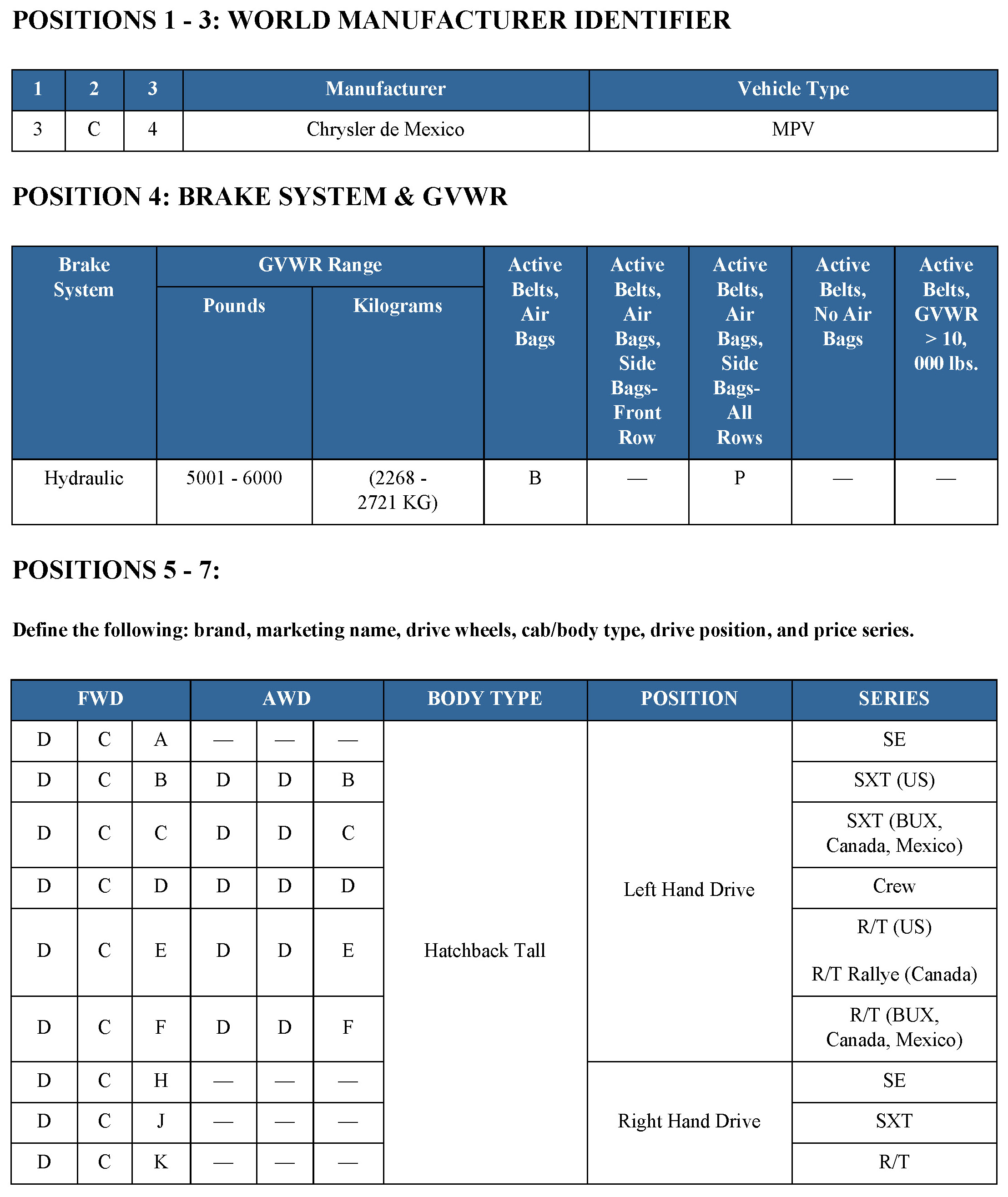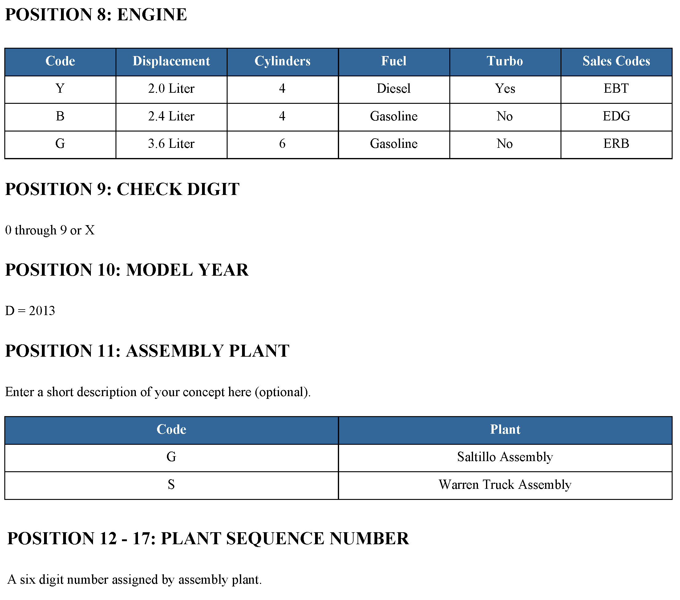The Vehicle Identification Number (VIN) plate is attached to the top left side of the instrument panel. The VIN contains 17 characters that provide data concerning the vehicle. Refer to the decoding chart to determine the identification of a vehicle.