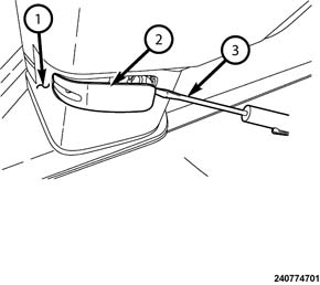 2. Using a flat blade screwdriver (3) or equivalent, insert blade into slot and gently pry upward to remove the panel (2) located below the left rear view mirror (1).