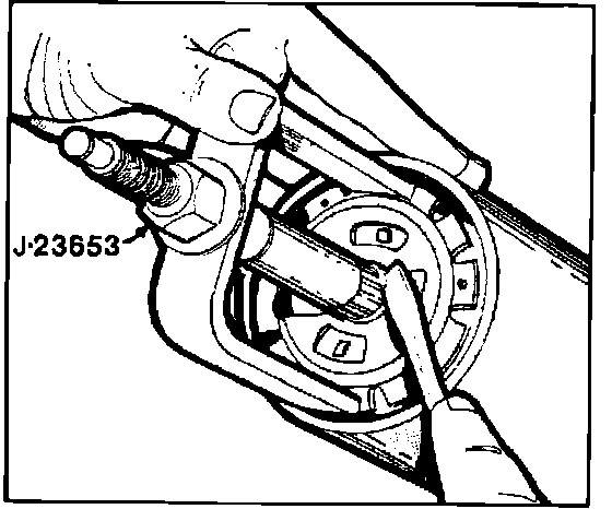 2. Using lock plate compressor tool No. J-23653, depress lock plate and remove and pry round wire snap ring from steering shaft groove. On some models, the steering shaft has metric threads and is identified by a blue colored steering wheel nut and/or a groove cut into the steering shaft splines. If shaft has metric threads, replace compressor forcing screw with metric forcing screw J-23653-4 to depress lock plate.