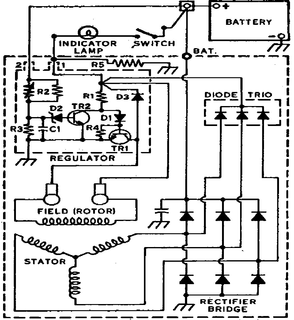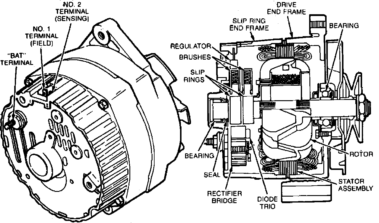 These units feature a solid state regulator mounted inside the alternator slip ring end frame, along with the brush holder assembly. All regulator components are enclosed in a solid mold with no need or provision for adjustment of the regulator. A rectifier bridge, containing six diodes and connected to the stator windings, changes A.C. voltage to D.C. voltage which is available at the output terminal. Generator field current is supplied through a diode trio which is also connected to the stator windings. The diodes and rectifiers are protected by a capacitor which is also mounted in the end frame.