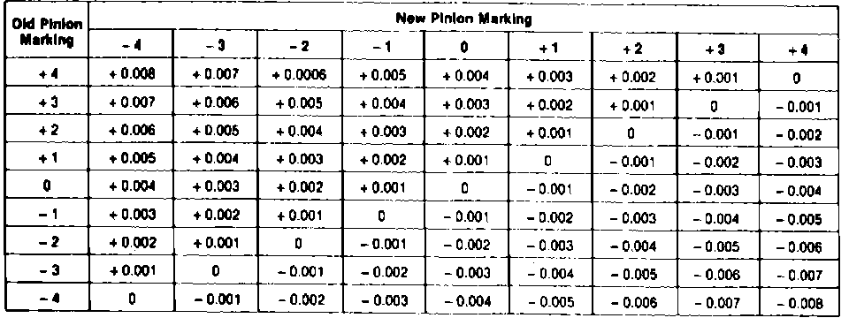 3. Refer to the chart to determine amount, in thousands, to be added or subtracted from original depth shim to arrive at pinion height. The pinion height arrived at is not the final shim thickness. An actual pinion depth measurement must be performed to determine final shim thickness.