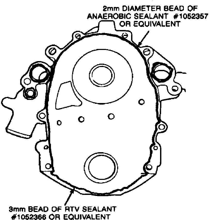 7. Apply a 3/8 inch bead of RTV sealer to joint where front cover meets oil pan, then a 1/4 inch bead of sealer to front cover to cylinder block mating surface.