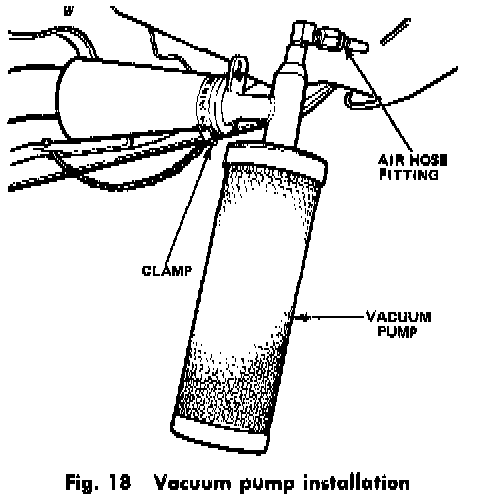 2. Connect hose of vacuum pump J-25077 on tailpipe and tighten clamp, Fig. 18.