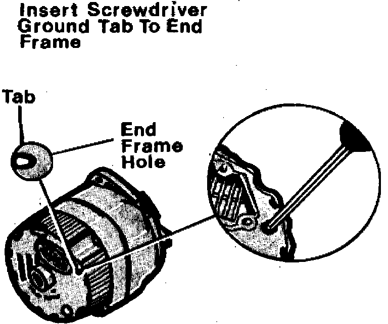 7. If ammeter reading is not within 10 amps of rated output, ground field winding by inserting screwdriver in end frame hole, contacting tab. Do not insert screwdriver deeper than one inch since tab is usually located within {3-4} inch of casing surface.