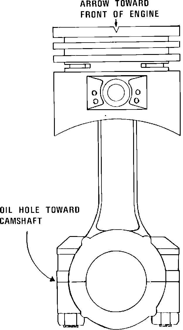 Pistons are marked with an arrow on the top perimeter, Fig. 12. When installing piston in engine, the arrow must face toward front of engine. Always assemble rods and caps with oil squirt holes facing camshaft. Check side clearance between connecting rod and crankshaft journal. Clearance should be .010 to .019 inch.