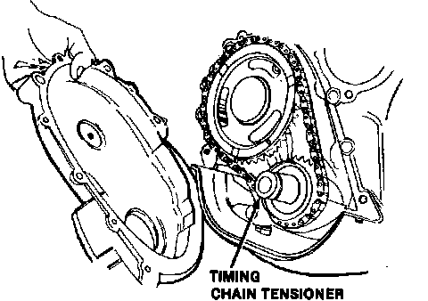 c. Install timing chain tensioner on cylinder block and torque bolts to 14 ft. lbs.