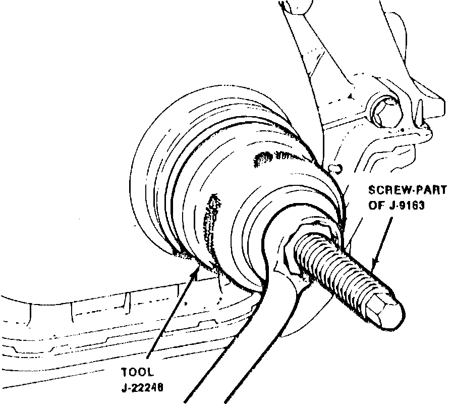 7. Insert draw screw of tool No. J-91632 or equivalent into tool No. J-22248. Tighten draw screw nut until tool comes in contact with timing chain cover.