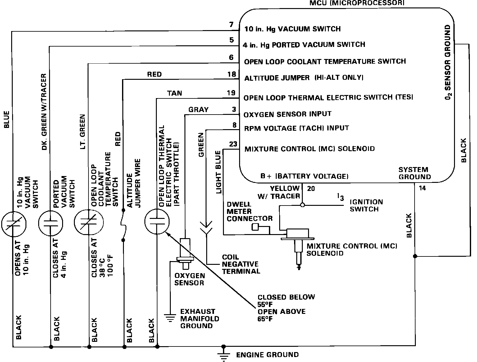 This system, Figs. 5a and 6a, controls the air fuel ratio through the use of various engine sensors that monitor engine operating conditions, a micro computer unit (MCU) that processes the signal from the mixture control solenoid (4-150) located inside the carburetor that controls the air/fuel ratio according to the signals received. During operation, this system maintains the engine in either the closed loop or open loop mode of operation.