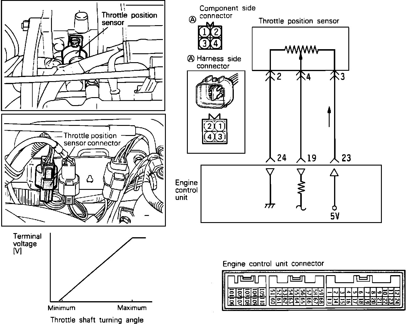 2. Using a high-impedance digital voltmeter, carefully back probe the throttle position connector into terminals 2 and 4. Refer to the connector in the image.