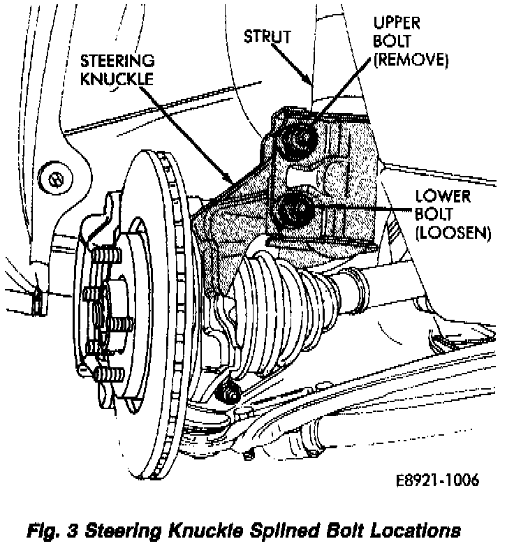 CAUTION: The strut bolts are splined just under the bolt head. Do not turn the bolt. Hold the bolt head with a wrench and loosen/remove the nuts as needed. Then tap the upper bolt out of the strut and steering knuckle with a rubber or brass mallet.