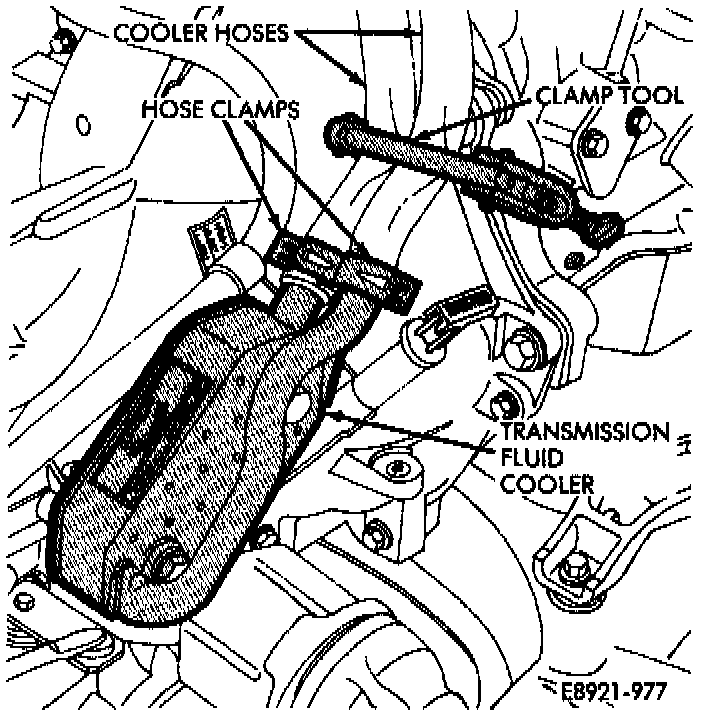 30. Connect the hoses to the transmission fluid cooler tubes. Secure the hose clamps and remove the clamp tool from the hoses.