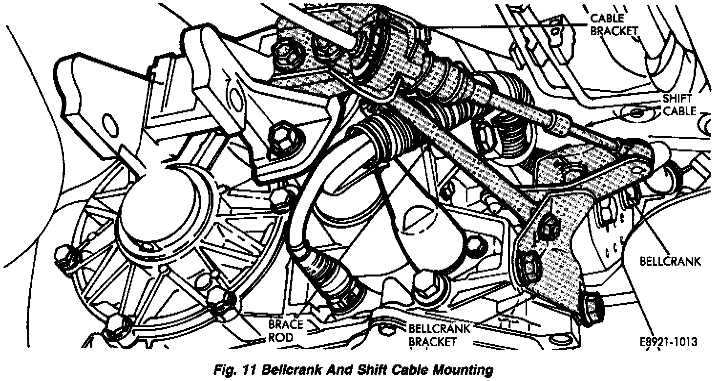 10. Install the bellcrank and bracket on the transaxle. Tighten the bracket-to-case bolts to 43 N.m (32 ft-lbs) torque.