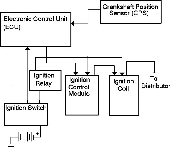 The Electronic Ignition System consists of a distributor, Ignition Control Module (ICM), Electronic Control Unit (ECU), Crankshaft Position Sensor (CPS), engine knock sensor and an ignition relay.
