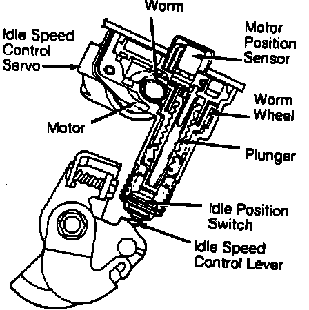 The Motor Position Sensor is part of the Idle Speed Control Servo, which is mounted on the side of the throttle body housing. The Motor Position Sensor sends a signal to the Control Unit indicating the position of the ISC Servo plunger.