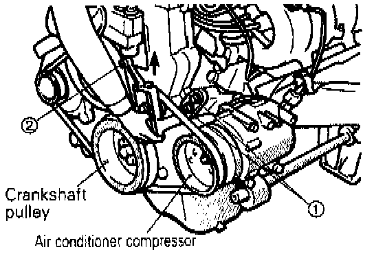 1. After loosening nut A (for holding the tension pulley), loosen bolt B (for adjustment) and reduce the tension of the compressor drive belt to zero.