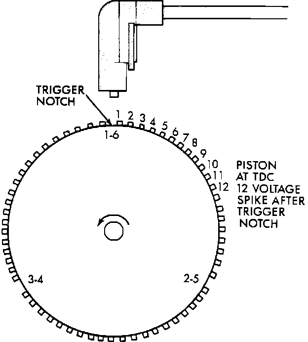 As a tooth and notch pass the magnetic core of the speed sensor, a voltage is induced in the sensor pick-up coil winding. The induced voltage signals allow the ECU to count the teeth as they pass by the speed sensor. When the sensor reaches a trigger notch, it causes a slight delay between the voltage signals. This delay alerts the ECU that a piston will be at TDC 12 voltage signals later. The ECU uses this information to control spark and fuel injection timing for each cylinder.
