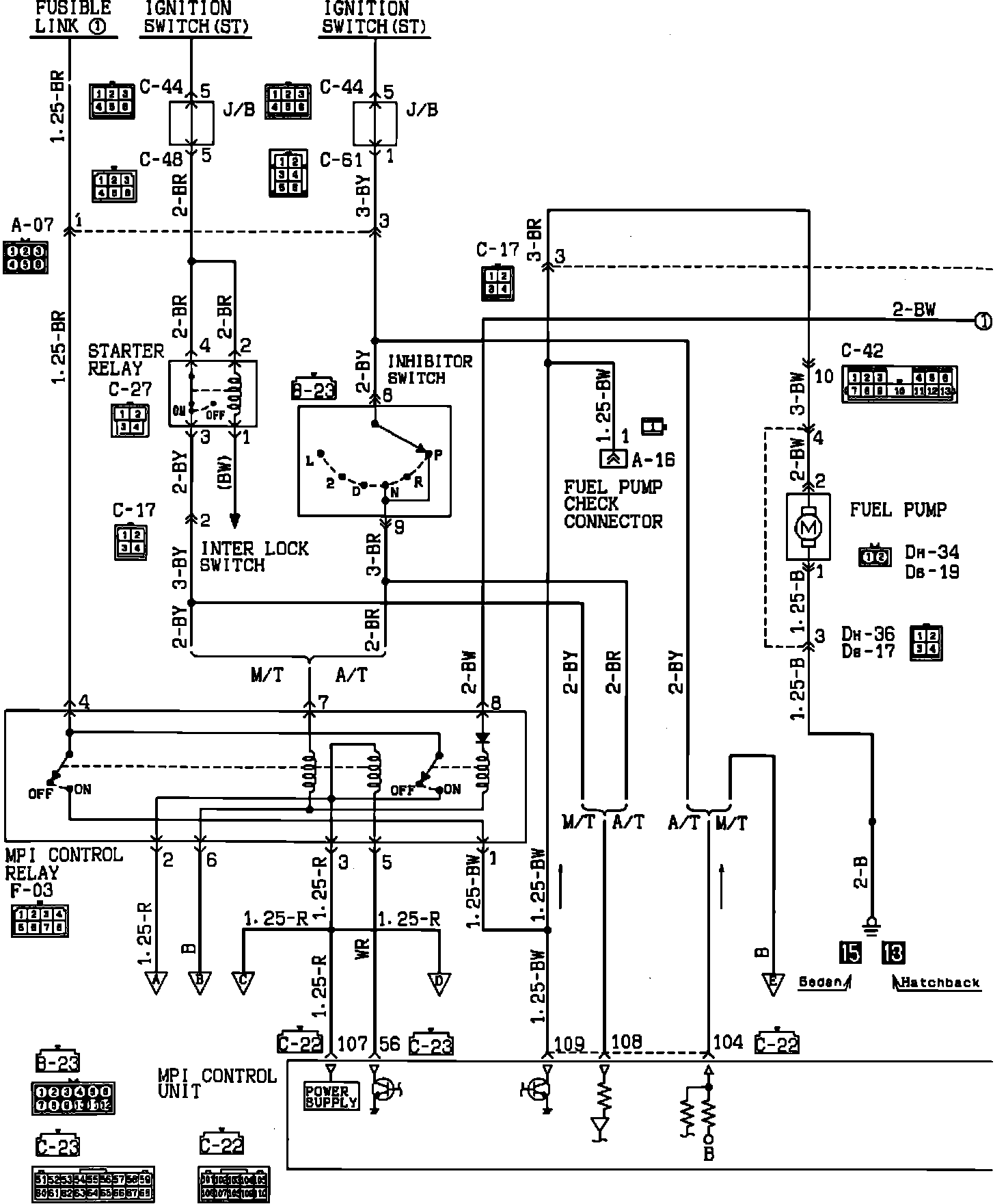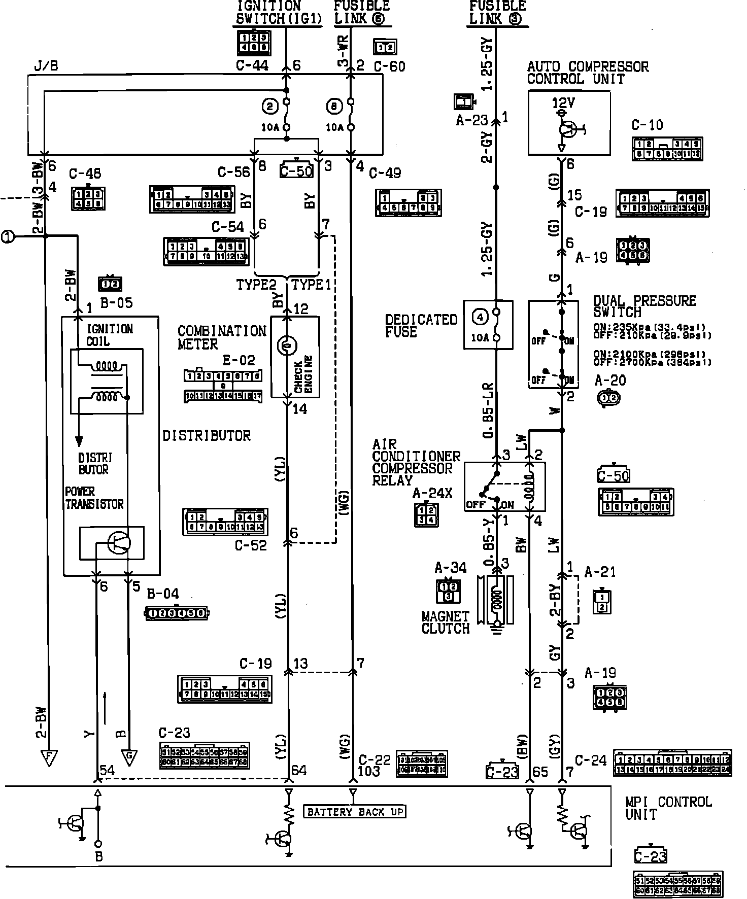 1. Check for an output signal from the MPI controller to the power transistor by connecting the positive lead of a high impedance voltmeter to terminal 54 of the MPI connector (C-23) and the negative lead to a good ground. There should be a fluctuating voltage signal when the engine is cranked or running.