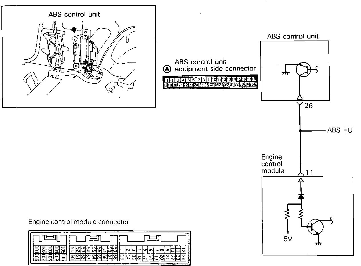 The engine ECU provides the ABS control unit with a 5 Volt reference signal. The engine ECU monitors this signal. When the ABS control unit determines that brake control is needed, the ABS control unit completes the ground circuit from the engine ECU. When this voltage drop is detected by the engine ECU. The ECU operates the idle speed control servo to provide effective anti-lock braking.